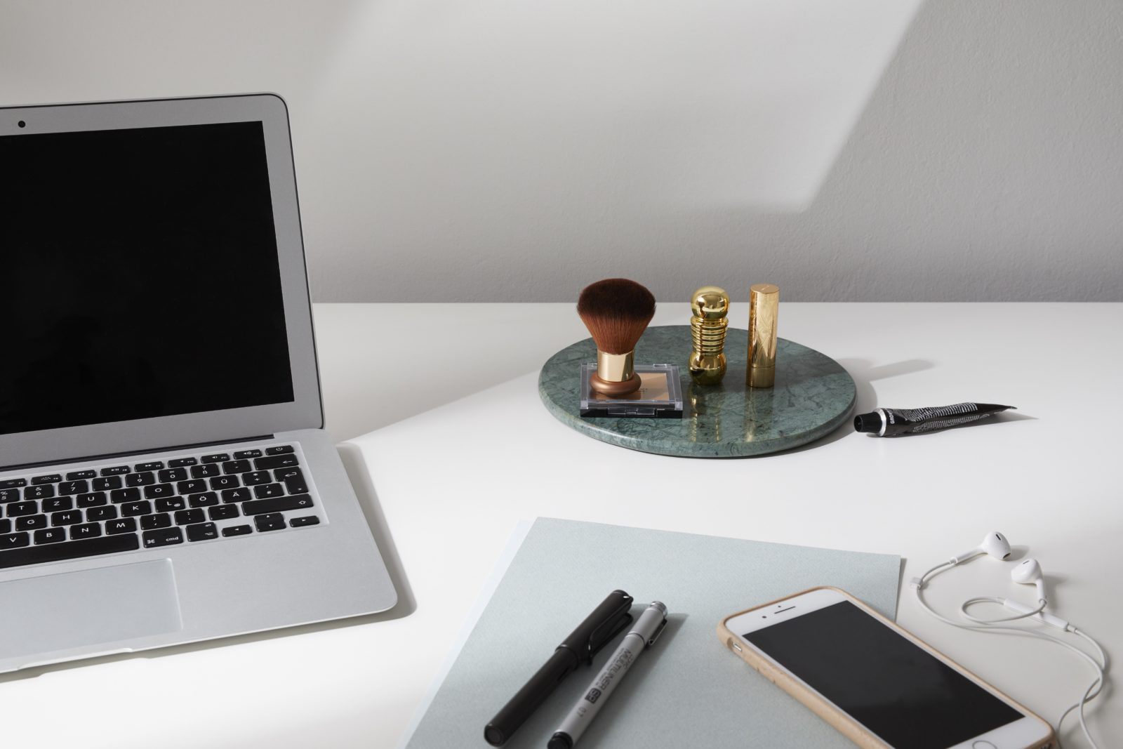 Auch wenn der No-Make-up-Look zum Home Office gehört wie der Flurfunk zum Büroalltag und wir uns eigentlich recht wohl damit fühlen: Video-Konferenzen lassen einen blass und müde aussehen. Bei wichtigen Calls kann eine schnelle Make-up-Routine Wunder wirken. Dafür einfach etwas Concealer unter die Augen, auf den Nasenrücken und auf die immer leicht geröteten Stellen neben den Nasenflügeln auftupfen. Zusätzlich noch etwas Highlighter in den inneren Augenwinkel geben – das sorgt ganz ohne Mascara für einen wachen Blick. Zum Schluss noch ein wenig Rouge auf die Wangen auftragen. Dabei solltest du mit dem Produkt nicht geizen, denn die Webcam schluckt nicht nur viel Licht, sondern auch Farbe, was für den ausgewaschenen Screen-Teint sorgt. Damit ein vorteilhafter und dennoch nicht übertriebener Look gelingt, das Make-up am besten nicht vor dem Spiegel, sondern mit Hilfe der Webcam auftragen. So siehst du genau, wie viel du brauchst, um frisch, aber nicht angepinselt auszusehen.