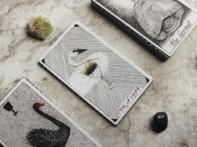 Tatsächlich gibt es genau einen Gegenstand auf meinen Nachttisch. Das Neo Tarot Kartenset, das mir die liebe Lori Haberkorn zum Geburtstag geschenkt hat. Ich ziehe jeden Morgen eine Karte, manchmal auch zwei. Und so liegt es griffbereit auf dem Tischchen. Ansonsten war es meine Ambition, das Schlafzimmer so ruhig und clean wie möglich zu halten. Keine Ablenkung, nicht mal neben dem Bett, und vor allem keine elektronischen Geräte, abgesehen von der Lampe, die ich nie benutze. Seitdem das Telefon im Wohnzimmer übernachtet ist, sind meine Träume viel intensiver geworden. Was mich dazu bringt, vielleicht sollte ich endlich mal Zettel und Stift auf dem Nachttisch liegen haben, damit ich morgens direkt alles aufschreiben kann und es nicht sofort wieder vergesse. Für das Foto habe ich noch meinen neuen Gua Sha dazu geschmuggelt, der wohnt eigentlich im Badezimmer. Aber bei der Abendroutine wird dann dir gleich klar, warum es für das Bild hier liegen sollte.